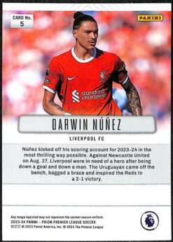 Card number 5 from the 2023–24 Panini Prizm Premier League collection, released as part of the Flashback 2012 insert line. The card features Darwin Núñez in Liverpool colours during the 2023-24 season, after his transfer from Benfica and first full seasons with the club. The Flashback 2012 parallel reproduces the 2012 Prizm design and its retro finish offers contrast with Liverpool’s red kit.