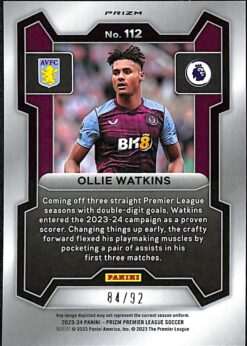 This Ollie Watkins Purple & White Stripes is card number 112 from the 2023–24 Panini Prizm Premier League release. It is serial-numbered 84/92, with only 92 copies produced.