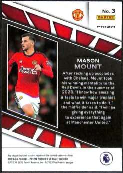 Card number 3 from the 2023-24 Panini Prizm Premier League collection, issued as part of the Silver Centre Stage parallel. The card features Mason Mount in Manchester United’s red home kit during his first season at the club following his move from Chelsea. This Silver Centre Stage variation carries a chrome-style finish which sets it apart from the standard insert, and highlights Mount’s arrival at a major club in a key transitional moment in his career.