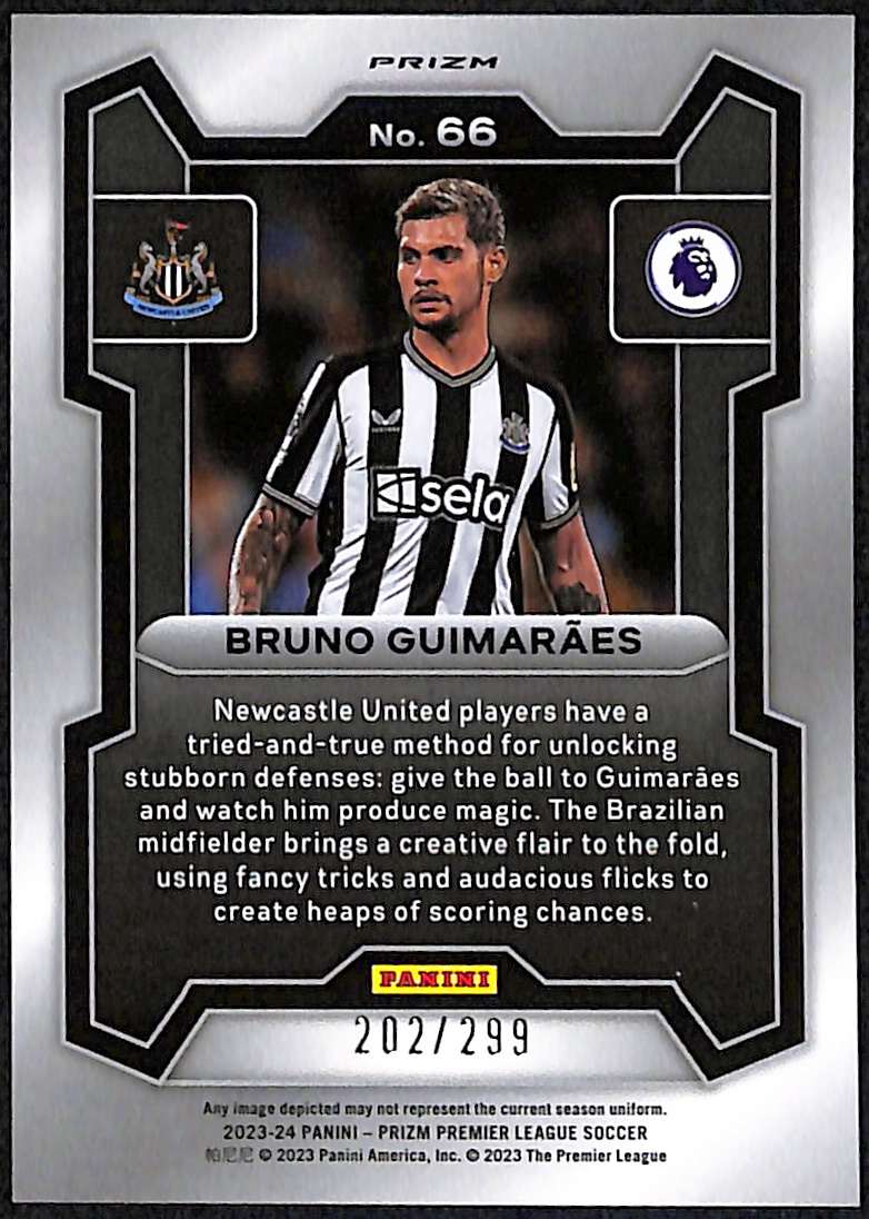 Bruno Guimaraes Blue Prizm parallel from the 2023-24 Panini Prizm Premier League collection. Card number 66 features the Brazilian midfielder who joined Newcastle from Lyon in January 2022 for £40 million. Numbered 202 of 299 produced.