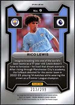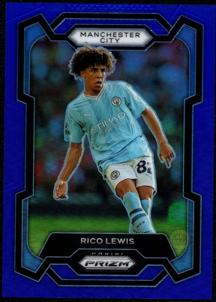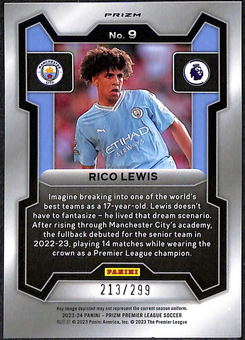 2023-24 Panini Prizm Premier League Blue Prizm Card 9 Rico Lewis 213/299