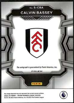 A genuine signed card from Fulham defender Calvin Bassey, featured in the 2023-24 Panini Prizm Premier League collection. This Red Stars parallel autograph combines striking red refractor technology with star patterns and an authenticated signature from the Nigerian international defender.
