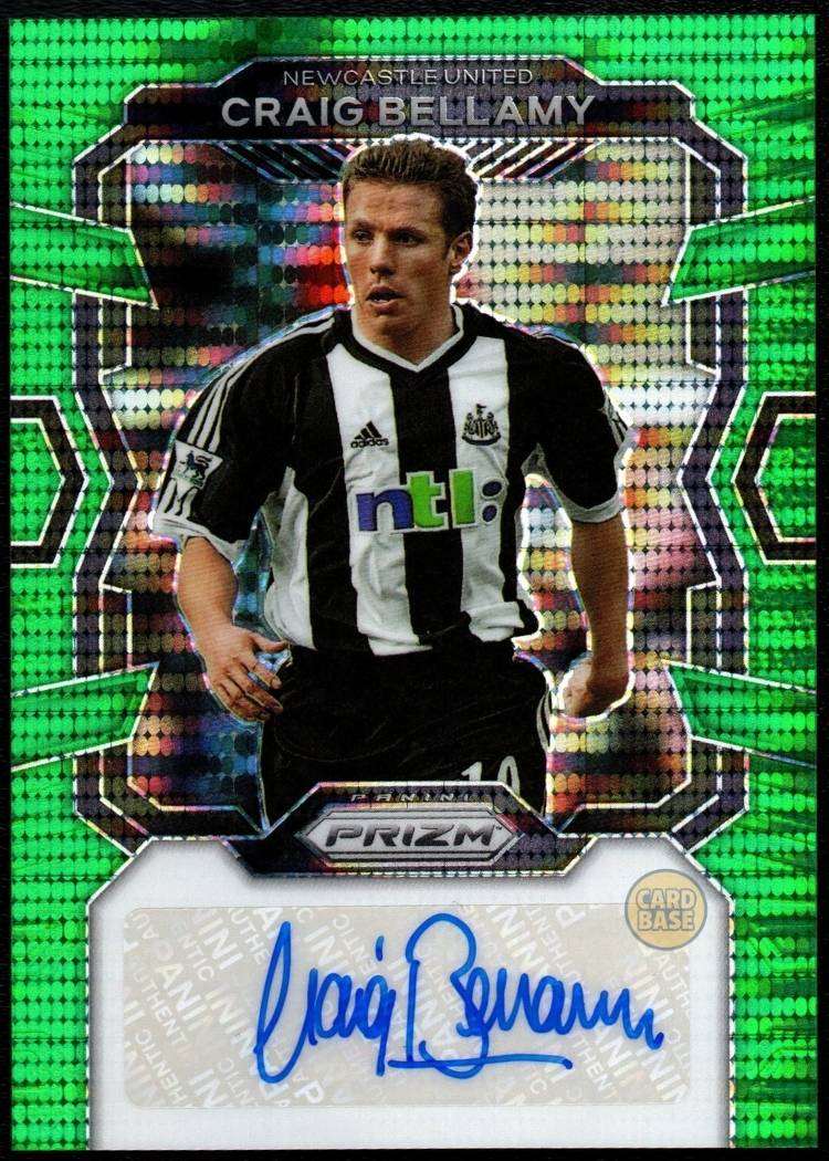Craig Bellamy signature card from the 2023-24 Panini Prizm Premier League collection. This Green Pulsar parallel features distinctive green chromium technology with an authentic on-card autograph. Bellamy enjoyed a distinguished career spanning 19 years, representing Wales 78 times and playing for clubs including Liverpool, Newcastle United, Manchester City and Cardiff City.