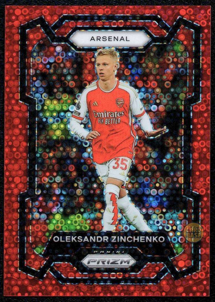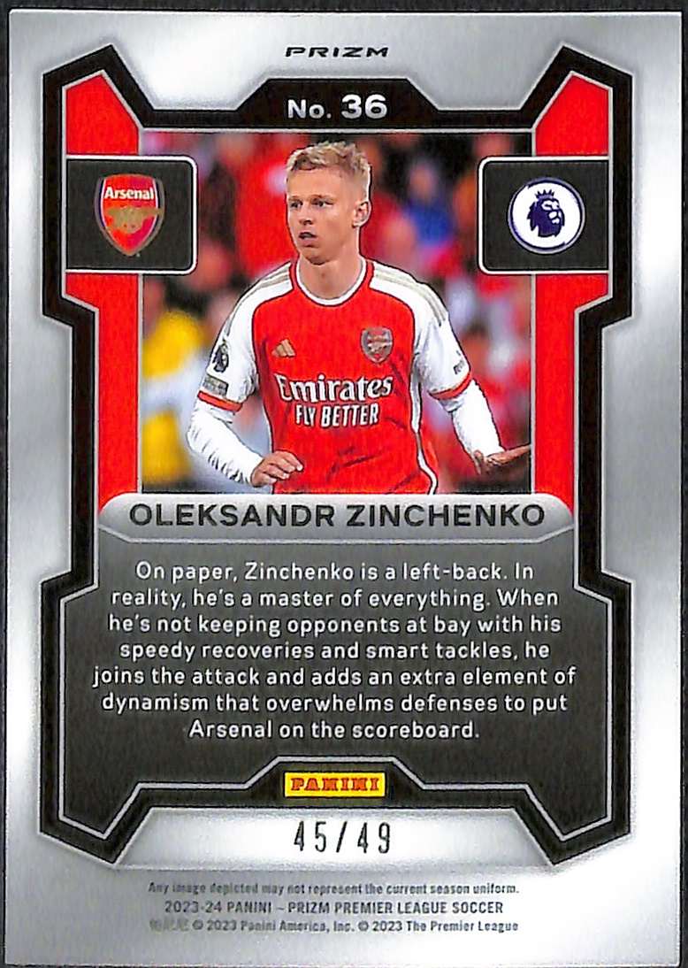 This Oleksandr Zinchenko Red Breakaway is card number 36 from the 2023-24 Panini Prizm Premier League collection. It is serial-numbered 45/49, with only 49 copies produced worldwide.