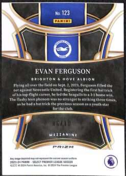 This Evan Ferguson Mezzanine Gold Prizm card is card number 123 from the 2023-24 Panini Select Premier League collection. It is serial numbered 6/10, with only 10 copies produced worldwide, making it one of the rarest Ferguson cards available.