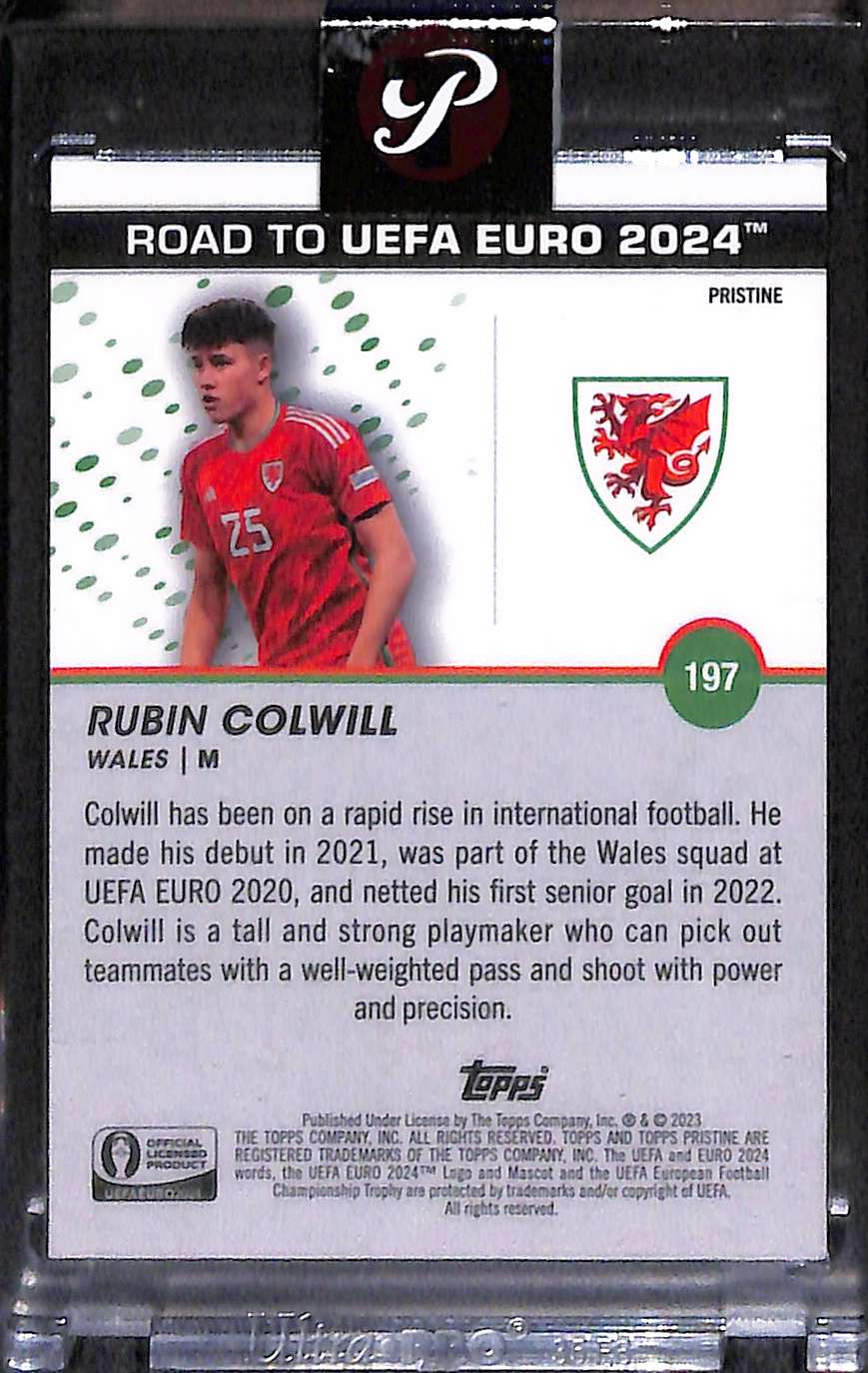 This Rubin Colwill Red Refractor is card number 197 from the 2023-24 Topps Pristine Road to UEFA Euro 2024 collection. It is serial-numbered 5/5, making it one of only five copies produced worldwide.