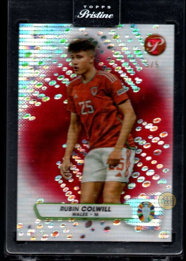 The vivid red refractor finish makes this a true colour match with the Wales home kit, giving it even greater visual appeal and collector significance. Topps Pristine’s chromium finish and ultra-low print run make this one of the most desirable Rubin Colwill cards available – a must-have for Wales fans and high-end collectors.