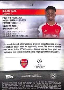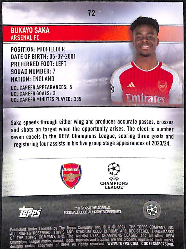 2023-24 Topps Stadium Club Chrome UEFA Club Competitions Card #72 Bukayo Saka