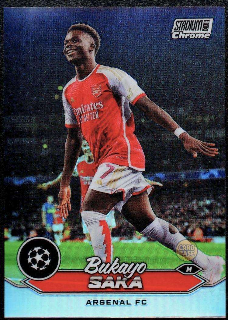 This card features Bukayo Saka in Arsenal colours, captured in the full-action photographic style for which Stadium Club Chrome is recognised.