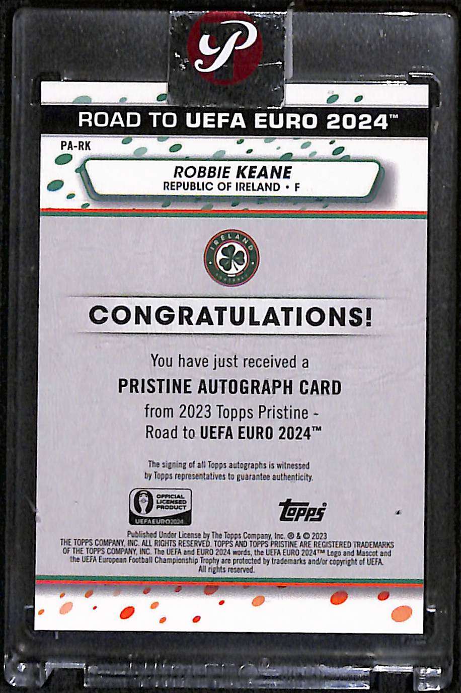 This edition contains a certified Robbie Keane signature on a sticker surface (not on-card), authenticated by Panini. The card forms part of the lead-in collection to UEFA Euro 2024, released to highlight former stars and current internationals associated with the competition.