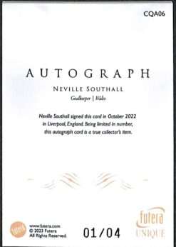 This Neville Southall Conquerors Autograph is card number CQA06 from the 2023 Futera Unique Conquerors series. It is serial-numbered 1/4, with only four copies produced worldwide.