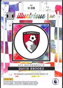 This David Brooks Illustrious Ink card is card number II-DB from the 2024-25 Panini Impeccable Premier League collection. It is serial numbered 47/75, with only 75 copies produced worldwide. The card is printed on extra-thick, high-quality stock with elegant foil accents and a clean matte finish, giving it a premium feel in hand. The Illustrious Ink subset is one of the signature autograph lines within Impeccable, known for its understated, luxury design and low print runs.