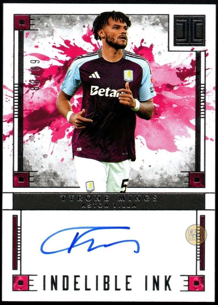 This Tyrone Mings Indelible Ink card is card number IN-TMG from the 2024-25 Panini Impeccable Premier League collection. It is serial numbered 80/99, with only 99 copies produced worldwide. The Indelible Ink subset is one of Impeccable’s signature autograph series, featuring a Panini-certified signature on thick, high-quality card stock with foil accents and a refined matte finish. This premium card celebrates one of Aston Villa’s defensive leaders and England internationals.