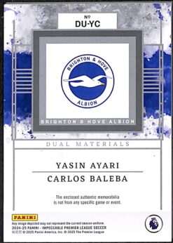 This Yasin Ayari & Carlos Baleba Dual Patch card is card number DU-YC from the 2024-25 Panini Impeccable Premier League collection. It is serial numbered 35/49, with only 49 copies produced worldwide. The card features two memorabilia patch windows – one for each player – in a balanced dual layout with foil detailing. Printed on thick, premium card stock, this is a well-presented, display-ready card for Brighton collectors.