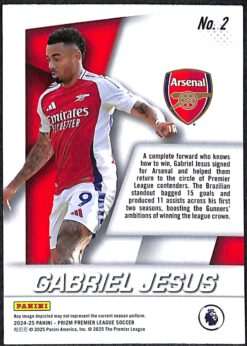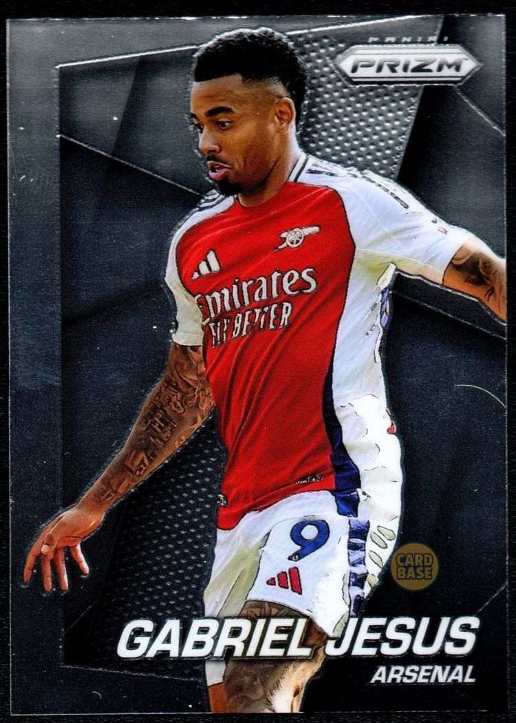This base card is unnumbered and hobby-wide, available across all formats of the 2024–25 Prizm release. Jesus is shown in Arsenal colours, marking his third Premier League campaign with the club following his transfer from Manchester City for £45 million in 2022.