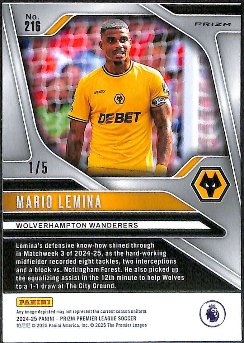 The Green Breakaway parallel is exclusive to Breakaway boxes and is one of the lowest-numbered parallels in the Prizm release. Lemina joined Wolverhampton Wanderers in January 2023 and made an immediate impact, helping the club to Premier League survival. He forged a strong midfield partnership with Joao Gomes during the 2023-24 season, scoring five goals and earning the club’s Player of the Season award.