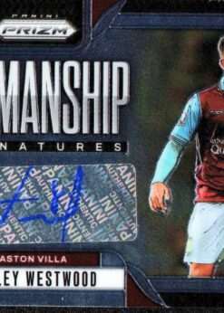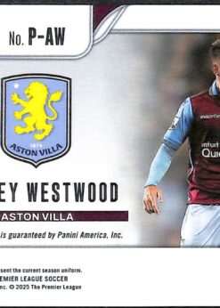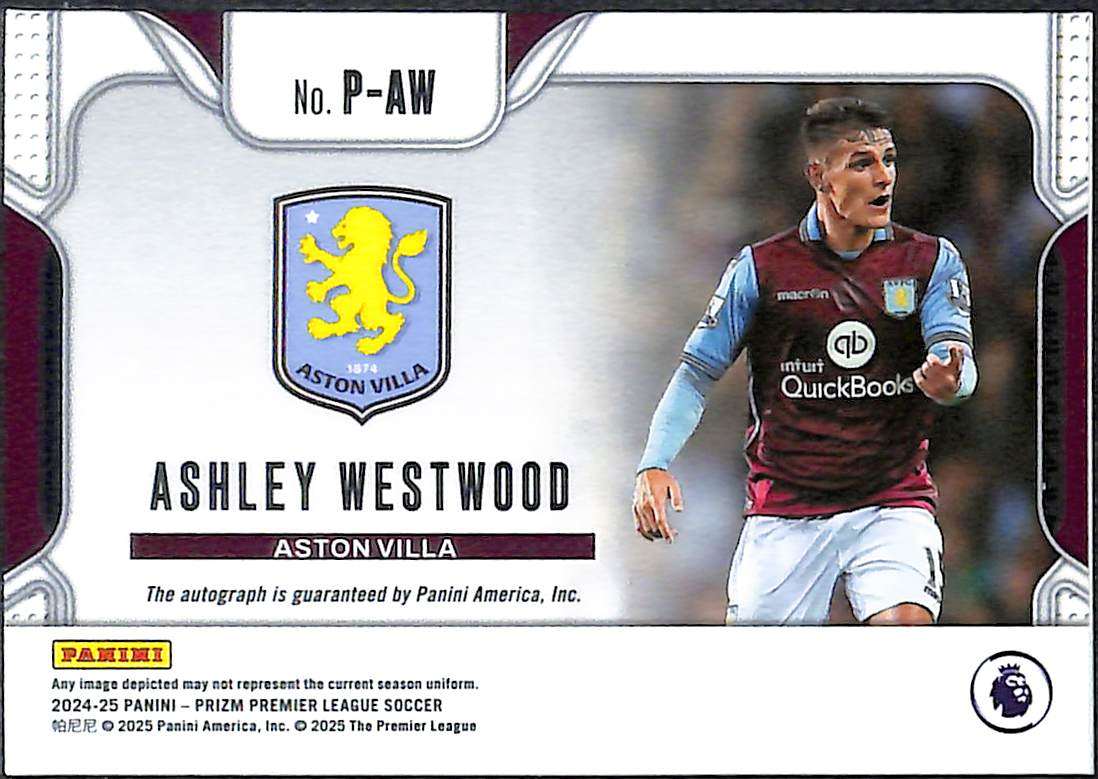 This card is part of the Penmanship Autograph insert set from the 2024-25 Panini Prizm Premier League collection. The numbering #P-AW identifies Ashley Westwood’s autograph variant. The parallel includes a Red Stars Prizm design variant.