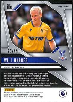 This Will Hughes Red Lazer is card number 168 from the 2024-25 Panini Prizm Premier League collection. It is serial-numbered 23/49, with only 49 copies produced worldwide.