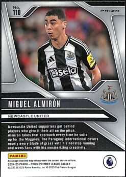 The Black and White Checker Prizm is one of the short-printed parallels in the Prizm line. Its chequered black-and-white design contrasts with Newcastle United’s traditional black-and-white striped kit, creating a distinctive effect. Almirón joined Newcastle in 2019 from Atlanta United for £21 million and has remained an important attacking option at St James’ Park through the 2024-25 season.