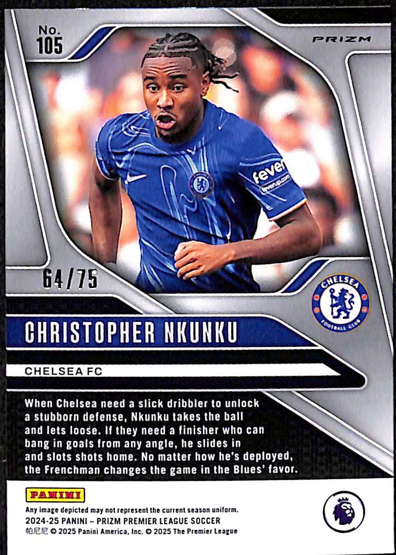 This Christopher Nkunku Blue Ice is card number 105 from the 2024-25 Panini Prizm Premier League collection. The card is serial-numbered 64/75, with only 75 copies produced worldwide.