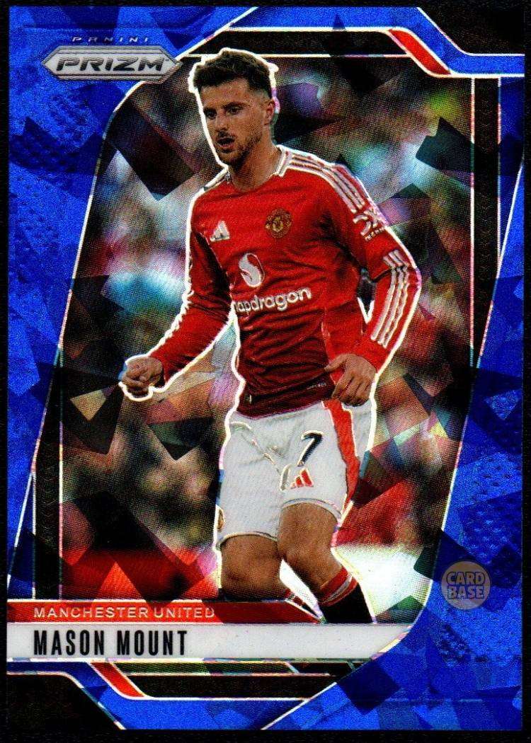 Mason Mount Manchester United Blue Ice parallel from the 2024-25 Panini Prizm Premier League collection. Mount joined United from Chelsea in 2023 for £55 million. This blue ice parallel is numbered 13 of 75, making it a scarce parallel.