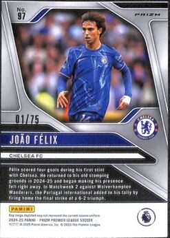 Félix joined Chelsea after a loan spell from Atlético Madrid and continues to represent Portugal at senior international level. The Blue Ice parallel pairs sharply with Chelsea’s home colours, producing one of the most visually striking cards in the 2024–25 Prizm release.
