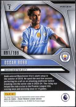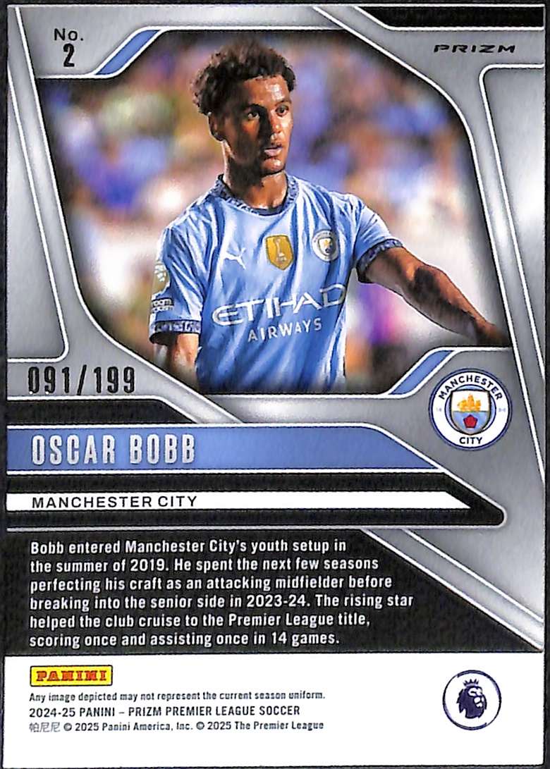 Oscar Bobb Red Prizm parallel card #2 from 2024-25 Panini Prizm Premier League. Numbered 91/299.