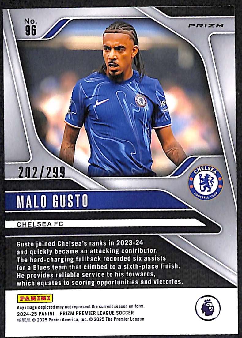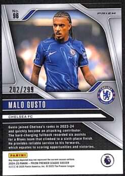 Malo Gusto Blue Prizm parallel card #96 from 2024-25 Panini Prizm Premier League. Numbered 202/299.