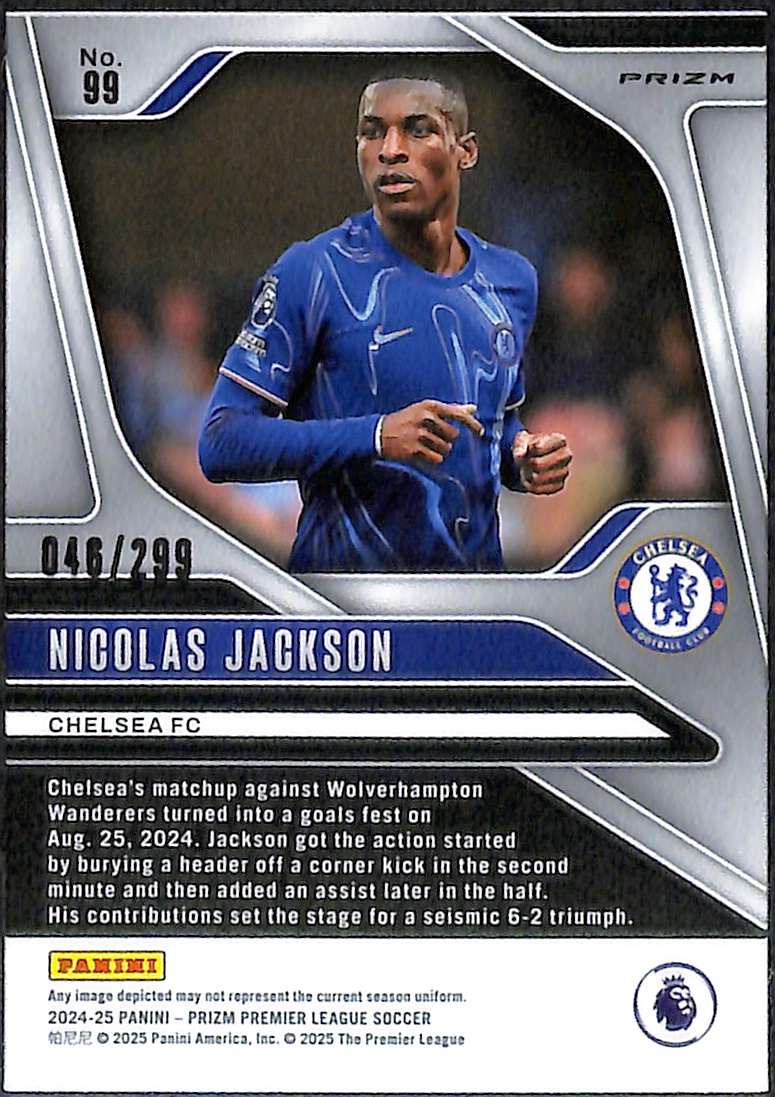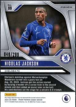 This Nicolas Jackson Blue Prizm is card number 99 from the 2024-25 Panini Prizm Premier League collection. It is serial-numbered 46/299, with 299 copies printed worldwide.