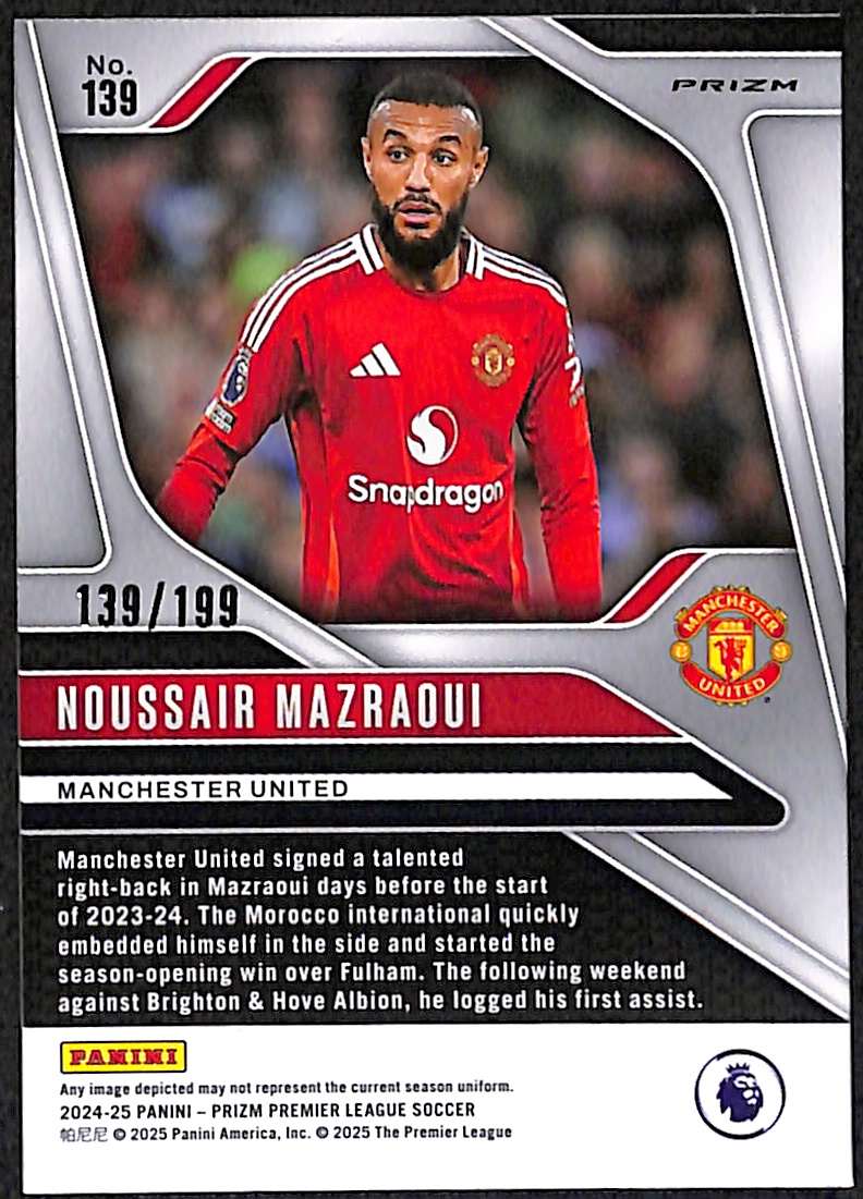 This Noussair Mazraoui Red Prizm parallel card is card number 139 from the Panini Prizm Premier League 2024-25 collection. It is a numbered parallel, with this specific card serial numbered 139/199, making it one of just 199 copies produced. The card features the exclusive Red Prizm finish, giving it a bold red refractor surface that shimmers under light. Mazraoui joined Manchester United in July 2024 from Bayern Munich, strengthening their options at right-back.