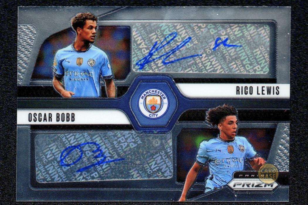Oscar Bobb & Rico Lewis Manchester City dual signature football card from the 2024-25 Panini Prizm Premier League collection. This special Dual Signature Insert features two of City’s brightest young stars with distinctive chromium technology. Bobb joined City from Valerenga in 2019, while Lewis is a City academy graduate who joined at age eight.