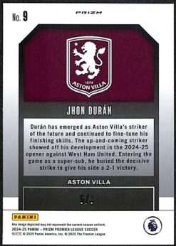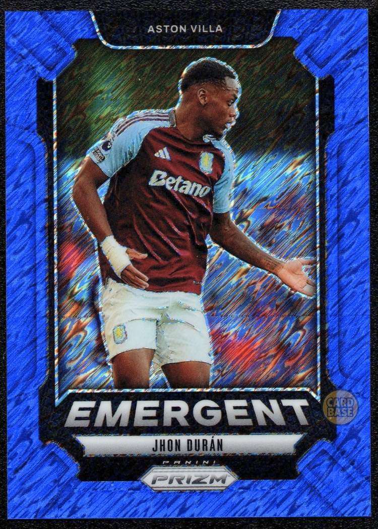 The Blue Shimmer parallel is among the rarest in the Prizm release, exclusive to hobby formats. Its shimmering blue finish contrasts with Aston Villa’s claret and blue kit. Durán joined Villa from Chicago Fire in 2023 for a fee rising to £18 million and quickly established himself as one of the club’s brightest young attacking prospects.