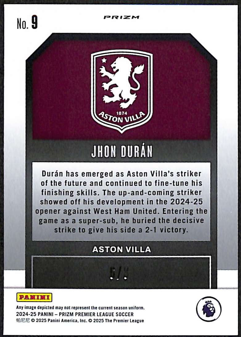 This Jhon Durán Emergent Blue Shimmer is card number 9 from the 2024-25 Panini Prizm Premier League collection. It is serial-numbered 6/8, with only 8 copies produced worldwide.