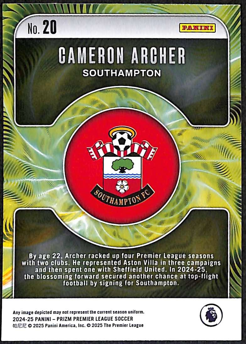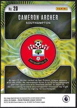 Cameron Archer Southampton football card from the 2024-25 Panini Prizm Premier League collection. This Fractal Insert features distinctive chromium technology. Archer joined Southampton from Aston Villa in August 2024 for £15 million.