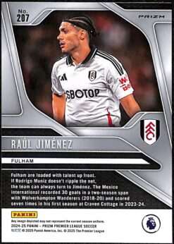 Raul Jimenez Fulham Lazer parallel from the 2024-25 Panini Prizm Premier League collection. This is card number 207 from the base set, featuring the distinctive lazer prizm refractor finish. The Mexican international striker joined Fulham from Wolverhampton Wanderers in July 2023.