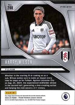 Harry Wilson Fulham Mojo Prizm parallel from the 2024-25 Panini Prizm Premier League collection. This is card number 208 from the base set, featuring the distinctive mojo prizm refractor pattern. The Welsh international winger joined Fulham from Liverpool in July 2021.