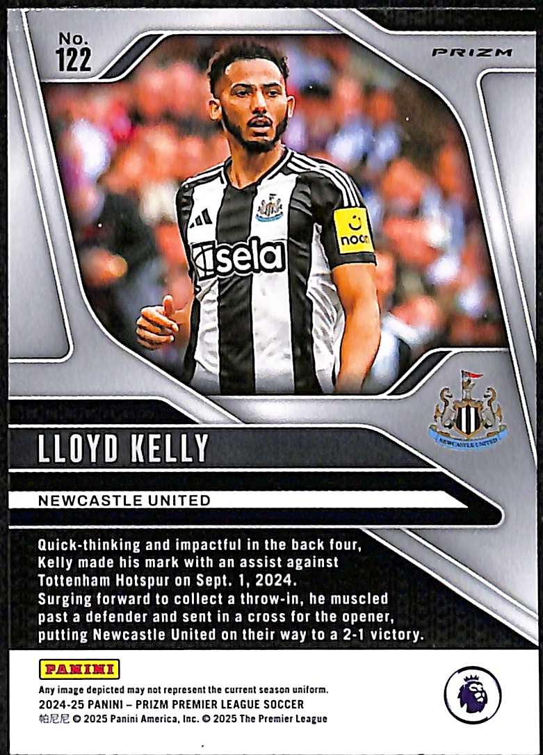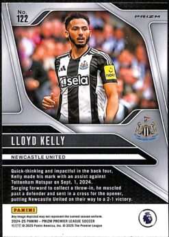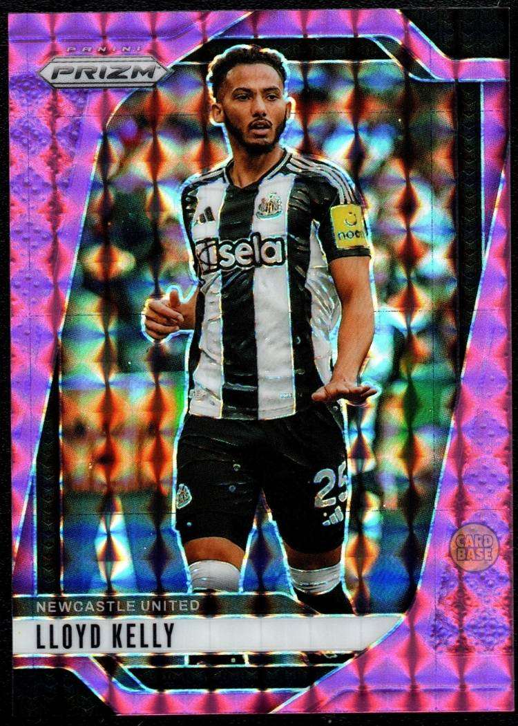 This Lloyd Kelly Pink Mosaic parallel card is card number 122 from Panini Prizm Premier League 2024-25 collection. It is an unnumbered parallel, distinguished by its vibrant pink mosaic refractor effect across the surface. It features a prizm refractor finish that reflects light with fractured pink shards, producing striking visual shimmer. Kelly joined Newcastle United on 1 July 2024, having left AFC Bournemouth at the end of his contract.