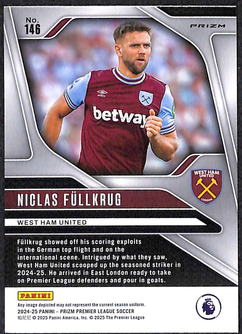This Niclas Füllkrug Pink Mosaic parallel card is card number 146 from the Panini Prizm Premier League 2024-25 collection. It is an unnumbered parallel, distinguished by its pink mosaic refractor effect across the card’s surface. It features a prizm refractor finish that reflects light with fractured pink shards to create vivid shimmer effects. Füllkrug joined West Ham United in August 2024 from Borussia Dortmund for a reported fee of about £27 million on a four-year deal.