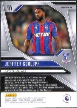 This Jeffrey Schlupp Pink Mosaic parallel card is card number 161 from the Panini Prizm Premier League 2024-25 collection. It is an unnumbered parallel, distinguished by its pink mosaic refractor effect across the surface. It features a prizm refractor finish that reflects light via fractured pink shards for a dynamic visual shimmer. Schlupp joined Crystal Palace from Leicester City in January 2017 for an initial fee reported at about £9 million, rising to £12 million with add-ons.