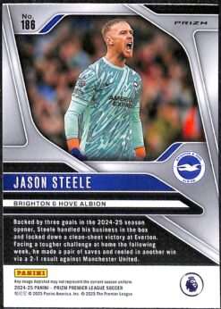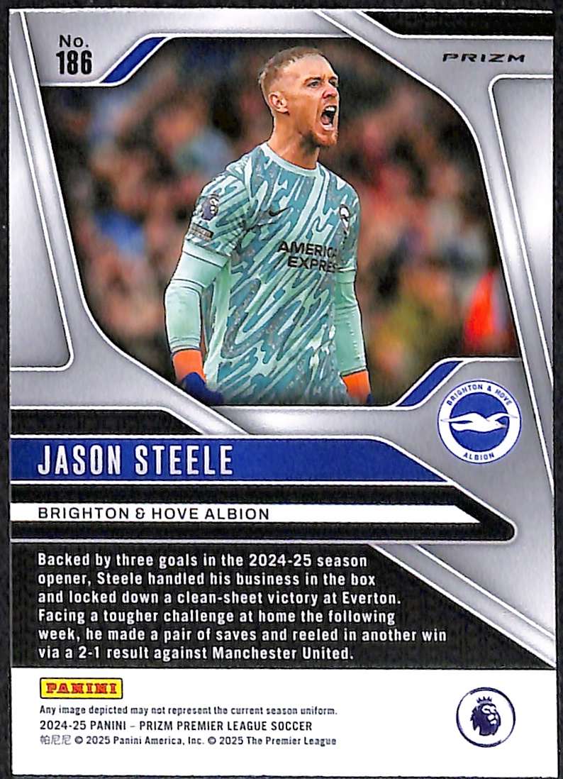 This Jason Steele Pink Mosaic parallel card is card number 186 from Panini Prizm Premier League 2024-25 collection. It is an unnumbered parallel, identified by its pink mosaic refractor effect shimmering across the surface. It features a prizm refractor finish that plays with light via fragmented, bright shards creating a mosaic appearance. Steele joined Brighton & Hove Albion in June 2018 from Sunderland on a free transfer.