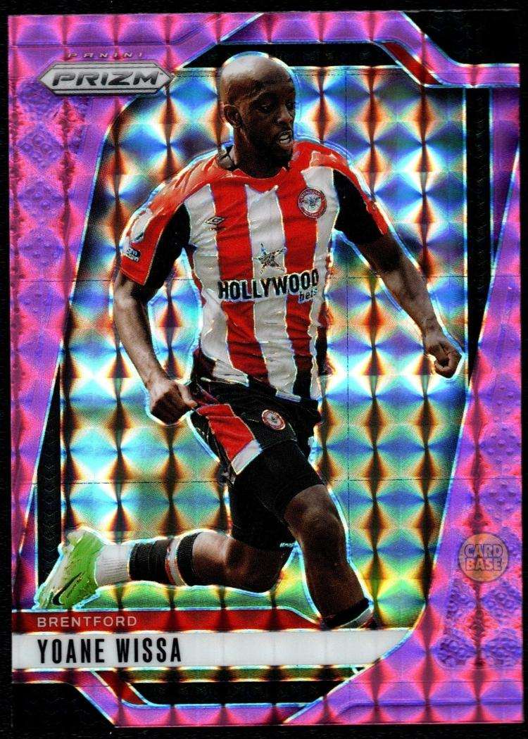 Yoane Wissa features on this spectacular Pink Mosaic parallel from the 2024-25 Panini Prizm Premier League collection. This Pink Mosaic parallel displays a captivating geometric pattern with vivid pink hues that create a mesmerising kaleidoscope effect. The prizm refractor finish delivers outstanding luminosity and shimmer, producing stunning rainbow reflections when viewed from different angles. The DR Congo international joined Brentford from French club Lorient in August 2021 for a fee of £8.5 million.