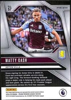 This Matty Cash Pink Mosaic parallel card is card number 57 from the Panini Prizm Premier League 2024-25 collection. It is an unnumbered parallel, distinguished by its vibrant pink mosaic refractor effect that covers the whole card surface. It features a prizm refractor finish that reflects light via fragmented pink shards, creating dynamic shimmer under different angles. Cash joined Aston Villa in September 2020 from Nottingham Forest on a five-year contract for an initial fee reported around £14 million, rising with add-ons.