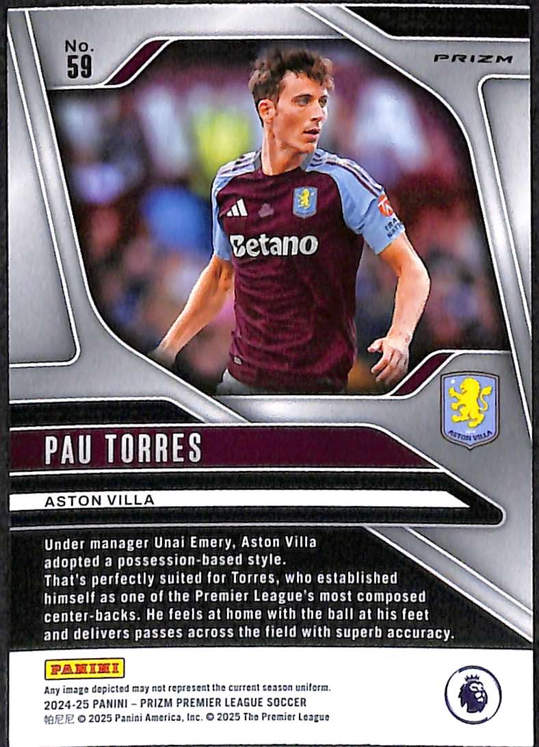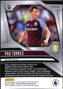This Pau Torres Pink Mosaic parallel card is card number 59 from the Panini Prizm Premier League 2024-25 collection. It is an unnumbered parallel, distinguished by its pink mosaic refractor effect across the surface. It features a prizm refractor finish that reflects light through fractured, pink-toned shards for a shimmering visual effect. Torres joined Aston Villa from Villarreal in July 2023 for a fee reported at about £31.5 million, signing a contract running until June 2028.