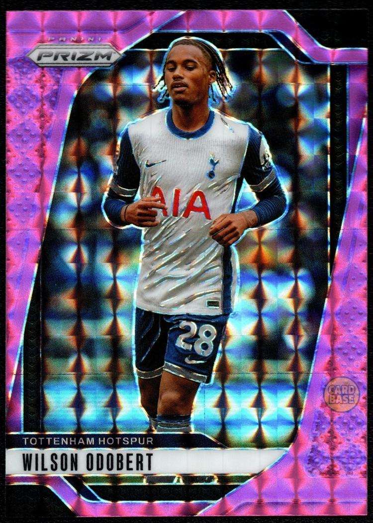 This Wilson Odobert Pink Mosaic parallel card is card number 78 from the Panini Prizm Premier League 2024-25 collection. It is an unnumbered parallel, distinguished by its vibrant pink mosaic refractor effect that covers the entire surface. It features a prizm refractor finish that reflects light through fractured pink shards, creating dynamic shimmer and depth. Odobert joined Tottenham Hotspur from Burnley on 16 August 2024, signing a contract running until 2029.