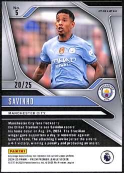 This Savinho Purple Breakaway parallel card is card number 5 from the Panini Prizm Premier League 2024-25 collection. It is a numbered parallel, with this specific card serial numbered 20/25, making it one of just 25 copies produced worldwide. The card features the Breakaway-exclusive Purple Prizm finish, combining a rich purple refractor colourway with a circular Breakaway pattern that reflects light dynamically. Savinho joined Manchester City from Troyes in July 2024 and has quickly become a rising star in European football.