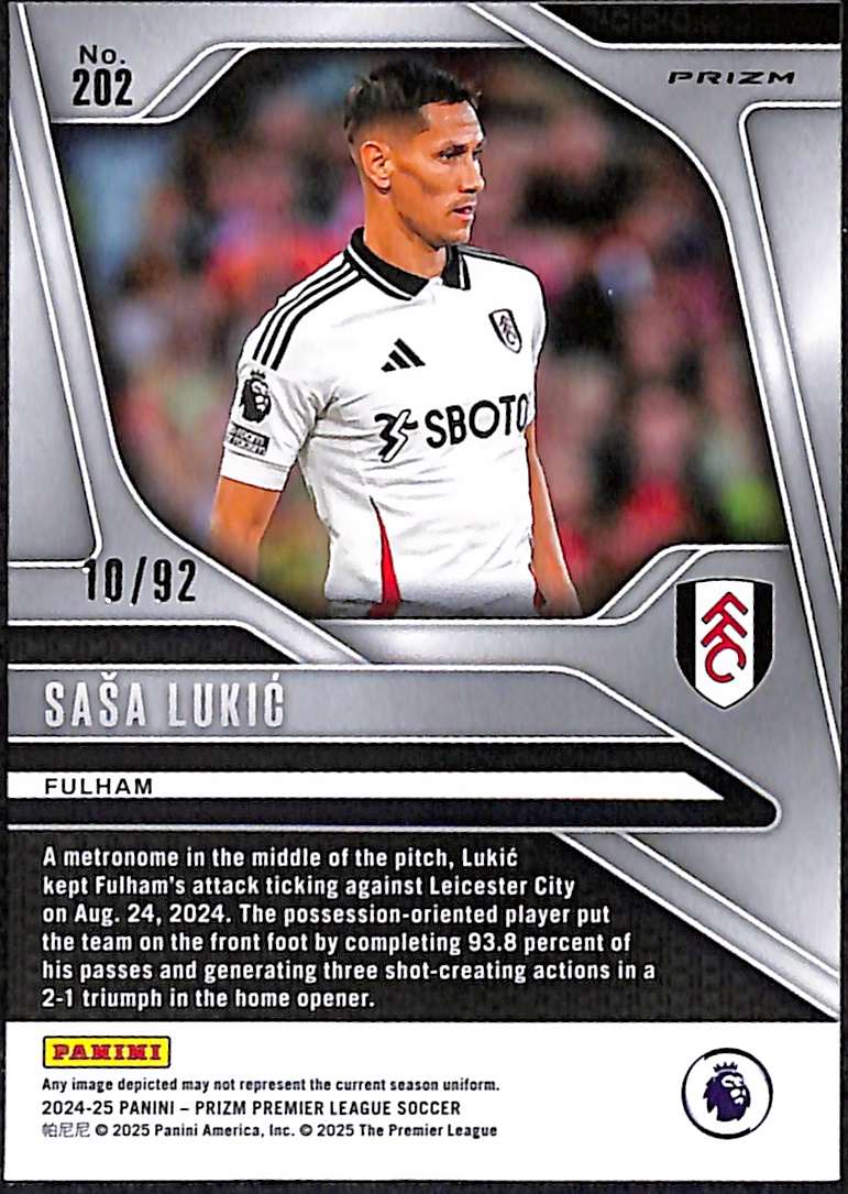 Sasa Lukic Fulham Purple White Prizm parallel from the 2024-25 Panini Prizm Premier League collection. This is card number 202 from the base set, featuring a scarce purple white prizm parallel limited to just 92 copies. Lukic joined Fulham from Torino in January 2023 for approximately £9 million. The Serbian international defensive midfielder is a product of Partizan Belgrade’s academy.