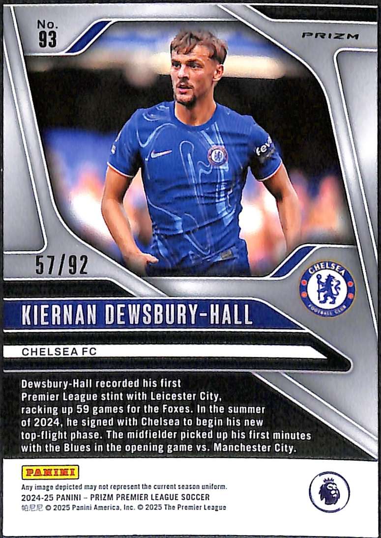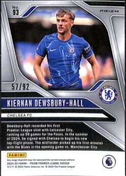 Kiernan Dewsbury-Hall Chelsea Purple White Prizm parallel from the 2024-25 Panini Prizm Premier League collection. This limited edition card is numbered 57/92, making it an extremely scarce collectable. The distinctive purple white prizm finish showcases Chelsea’s English midfielder in stunning detail. Dewsbury-Hall joined Chelsea from Leicester City in July 2024 for £30 million, reuniting with manager Enzo Maresca.