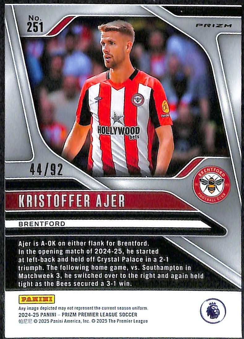 This Kristoffer Ajer Purple White Stripe Prizm is card number 251 from the 2024-25 Panini Prizm Premier League collection. It is serial-numbered 44/92, with only 92 copies produced worldwide.