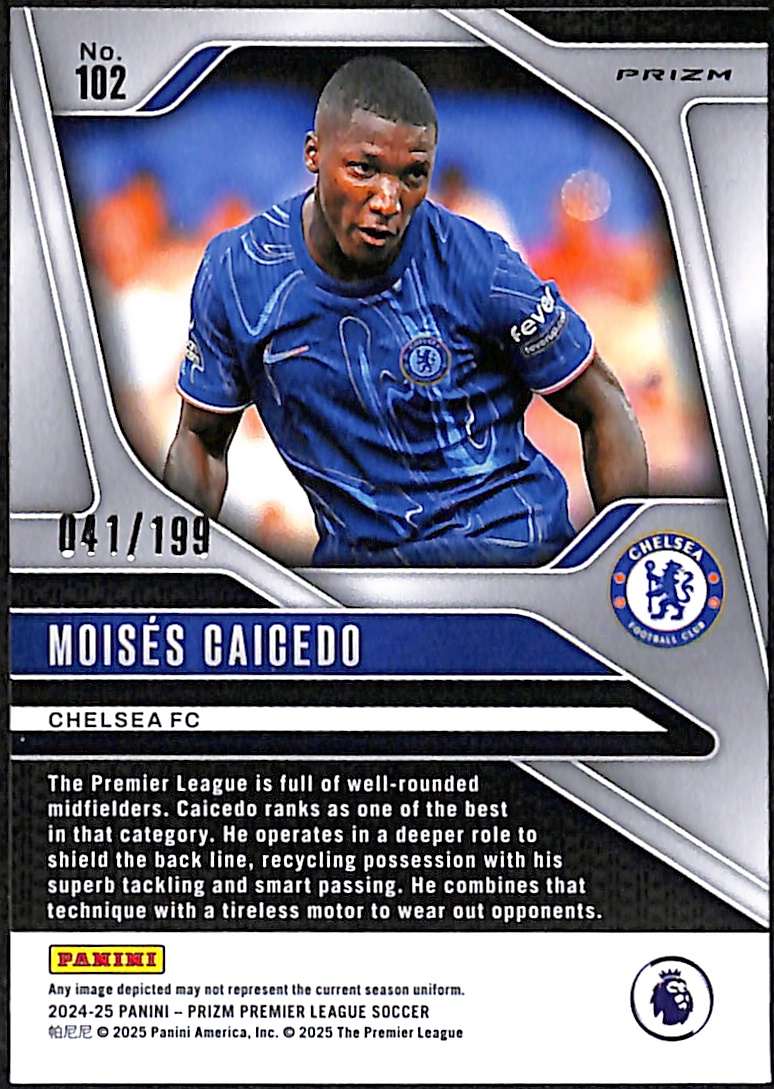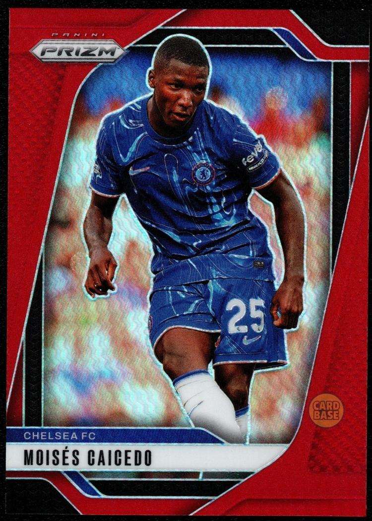 Moises Caicedo Chelsea Red Prizm parallel from the 2024-25 Panini Prizm Premier League collection. This limited edition card is numbered 41/199, making it a scarce collectable. The distinctive red prizm finish showcases Chelsea’s Ecuadorian defensive midfielder in brilliant detail. Caicedo joined Chelsea from Brighton in August 2023 for a British record £115 million, with an initial £100 million plus £15 million in performance-related add-ons.