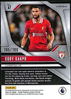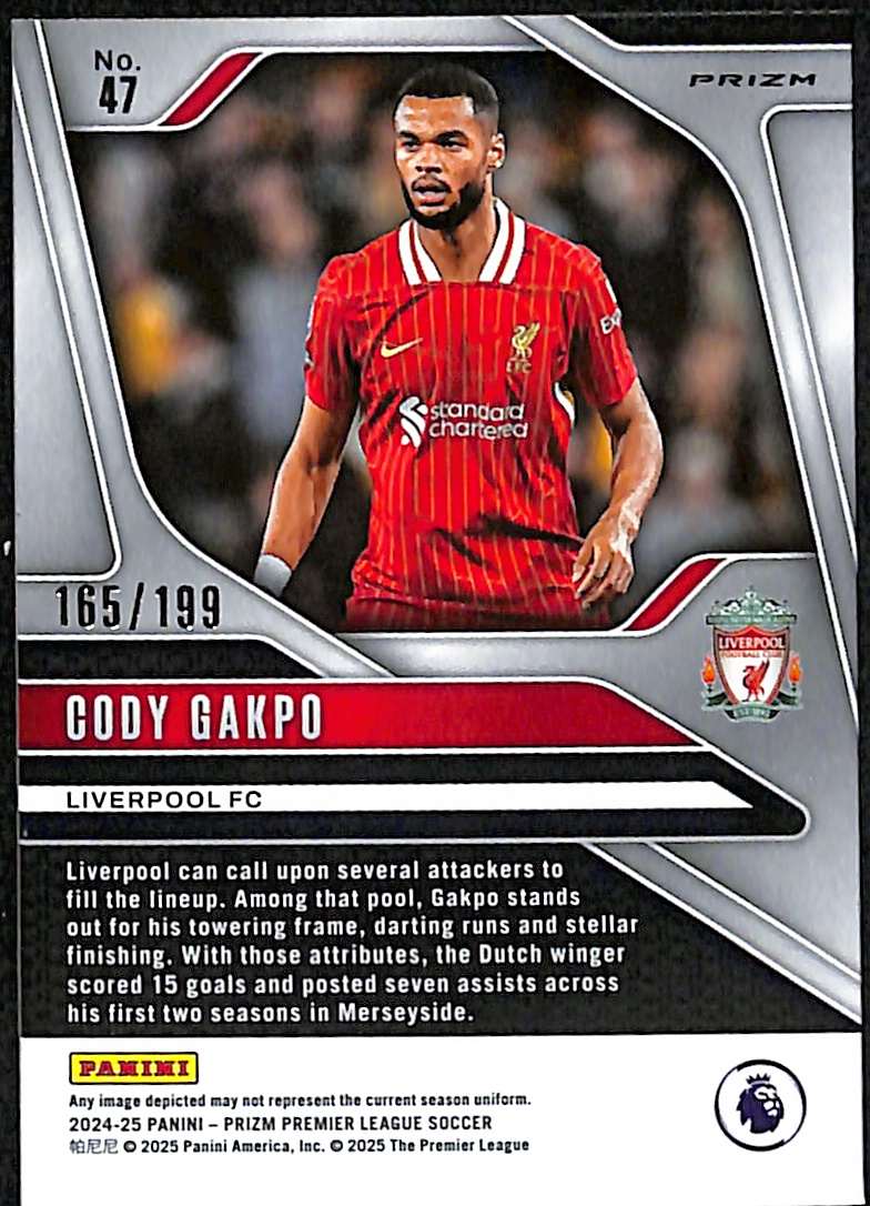 This Cody Gakpo Red Prizm is card number 47 from the 2024-25 Panini Prizm Premier League collection. It is serial-numbered 165/199, with 199 copies printed worldwide.